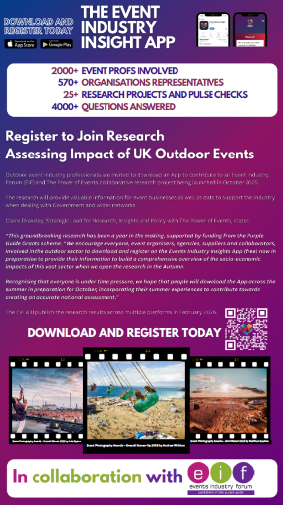 Via The Power of Events, Claire has been commissioned to deliver a national piece of research evaluating the economic and social value of the outdoor events sector. This sector is a diverse and highly dynamic part of the events industry ranging from agricultural shows to major music festivals, and from creative processions to community celebrations. This research will be published in April 2026. The surveys are now LIVE: As a supplier you can join in bygoing to https://www.thepowerofevents.org/eif-value-of-outdoor-events-study-supply-chain/ OR as an event organiser go to https://www.thepowerofevents.org/eif-value-of-outdoor-events-study/